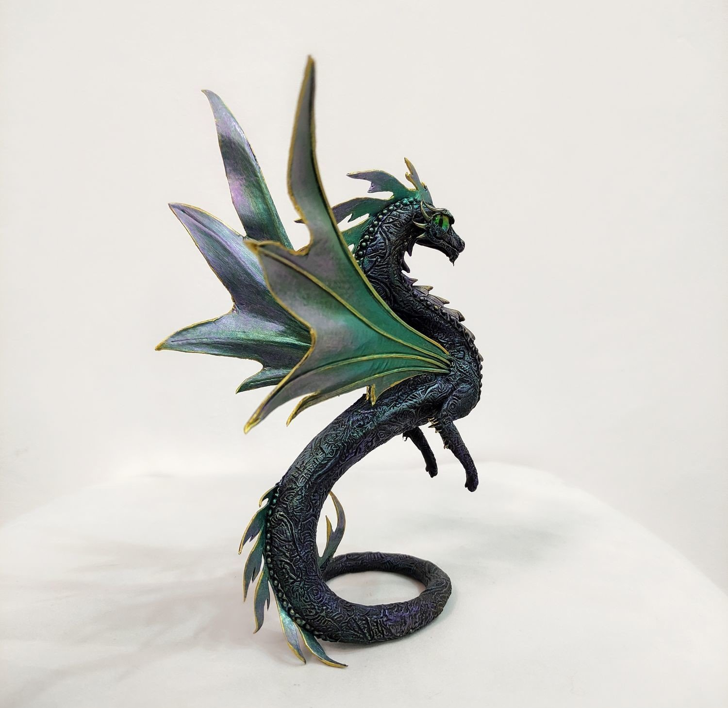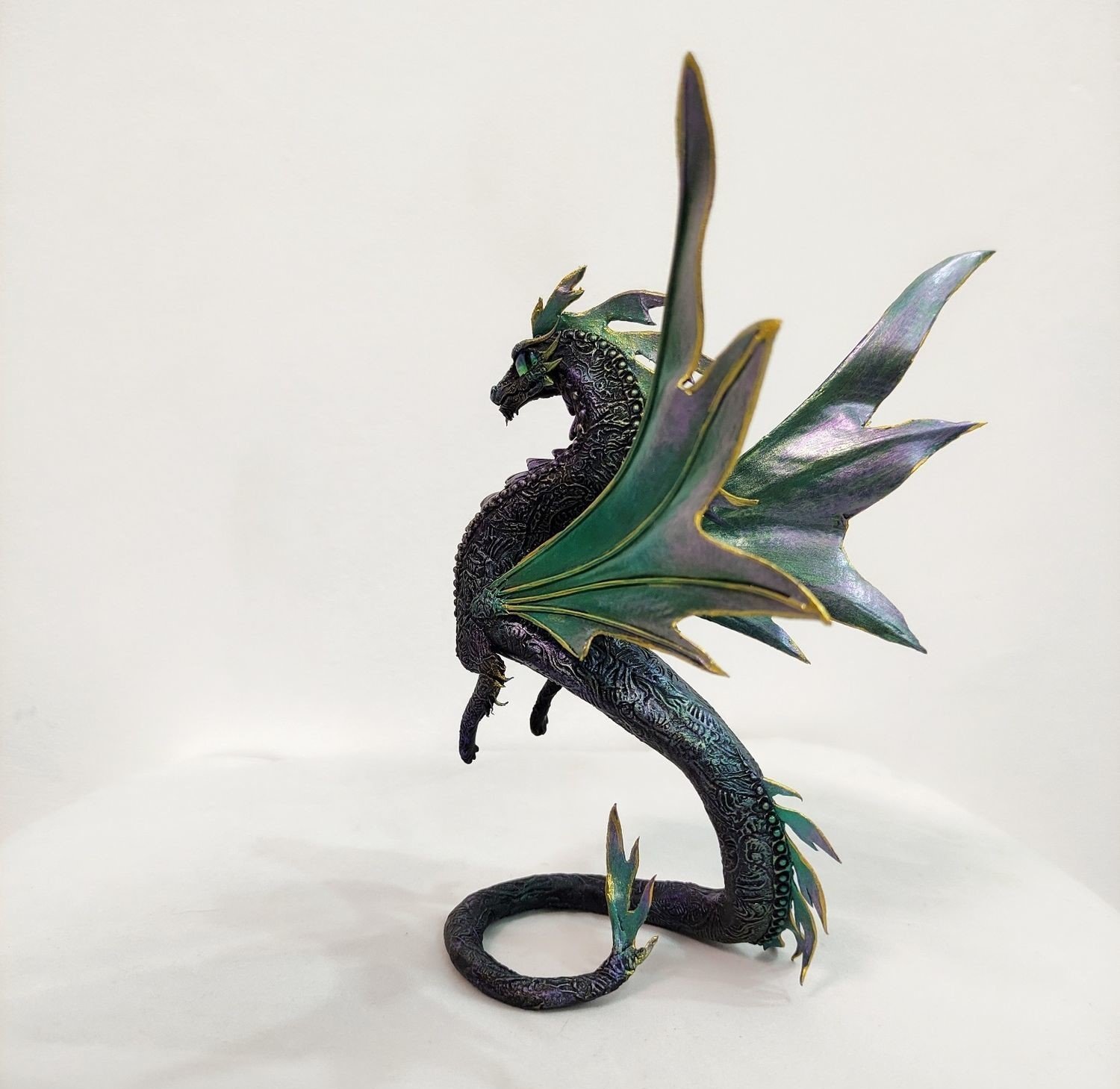 Materials: wire, acrylic paints, varnish, self-stiffening polymer clay, foil, velvet plastic, eyes